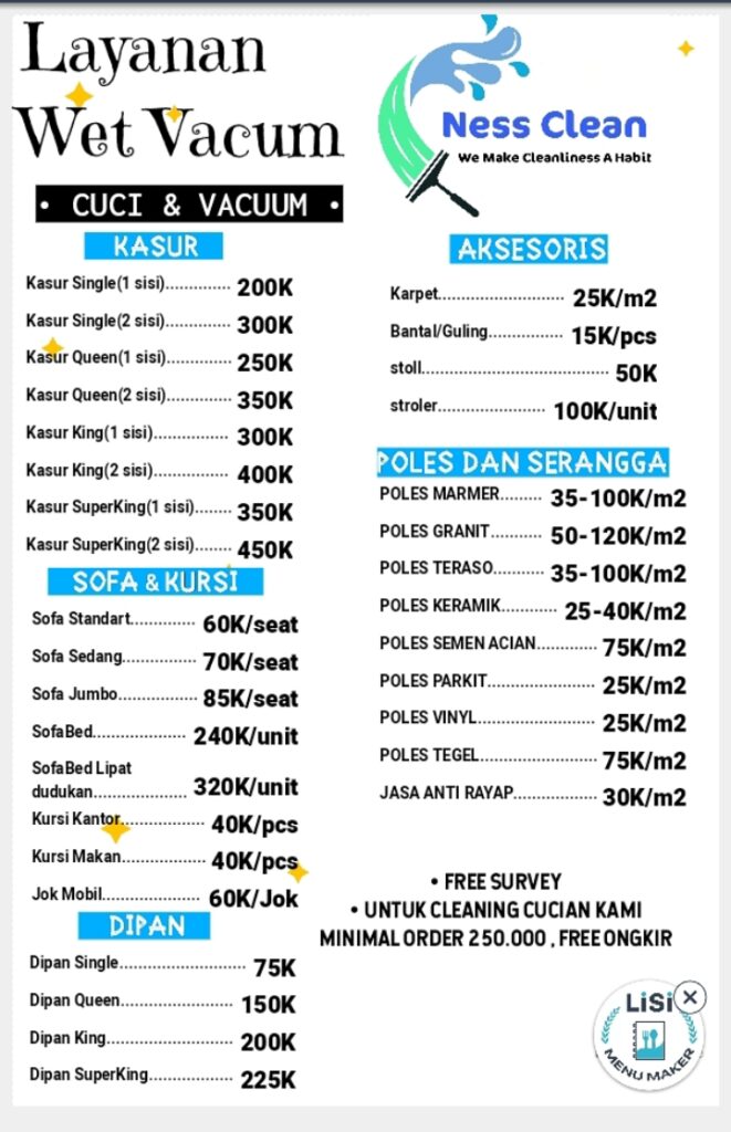 NessClean merupakan sebuah Jasa Layanan Kebersihan panggilan yang meliputi cuci sofa, cuci springbed, cuci karpet, cuci jok mobil, cuci kursi kantor,poles lantai dll. Dapatkan layanan kami di area jakarta dan sekitarnya.